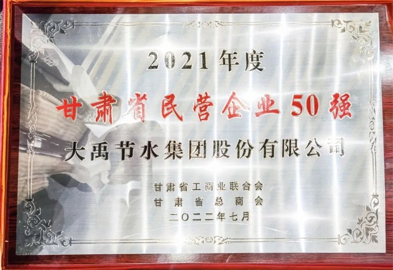 2022年7月4日大禹節(jié)水集團(tuán)榮獲2021年度甘肅省民營企業(yè)50強(qiáng)