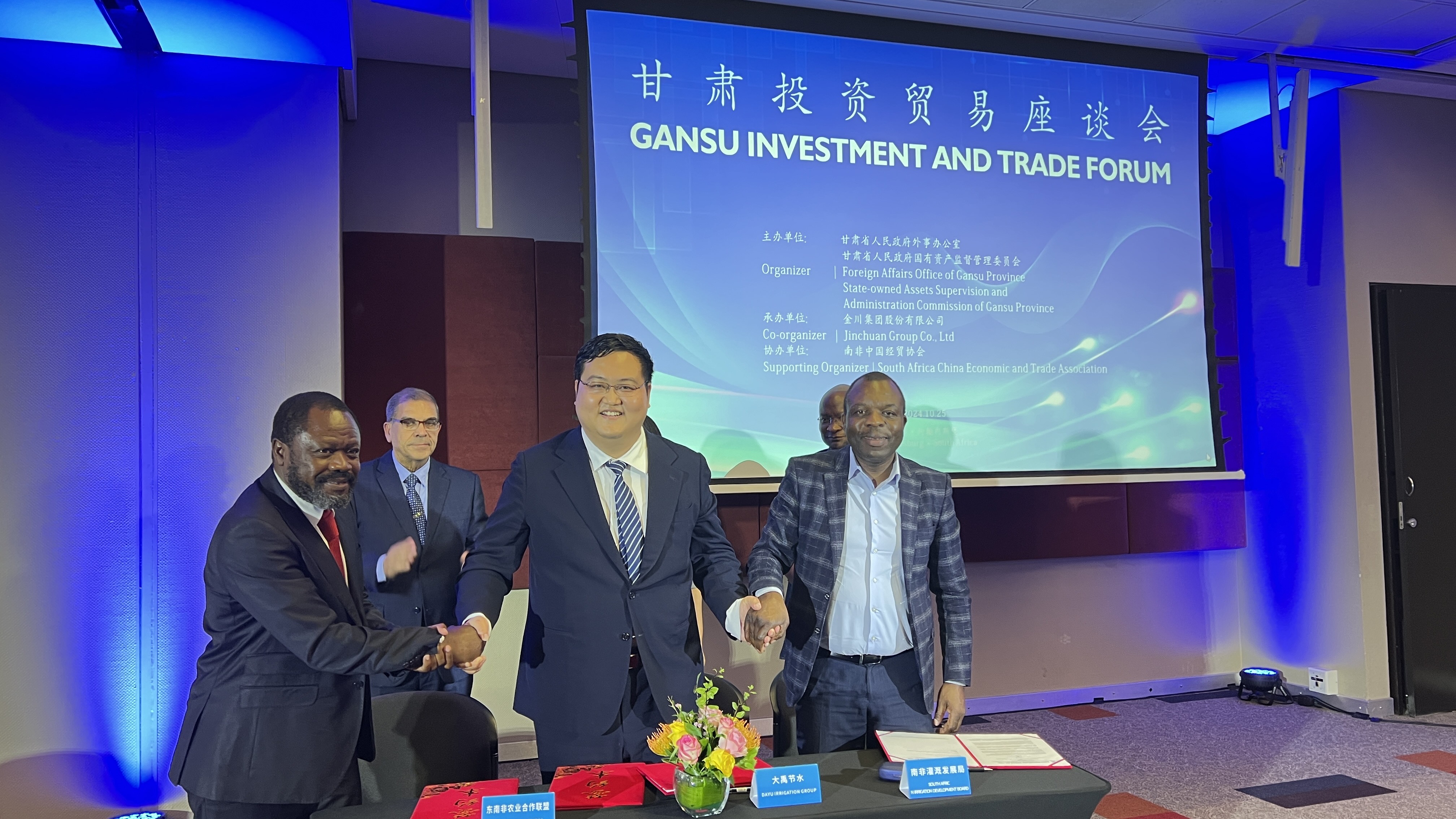 在甘肅省委書(shū)記、省人大常委會(huì)主任胡昌升見(jiàn)證下,大禹節(jié)水集團(tuán)在南非約翰內(nèi)斯堡與東南非農(nóng)業(yè)合作聯(lián)盟、南非灌溉發(fā)展局、中國(guó)進(jìn)出口銀行甘肅分行等多家機(jī)構(gòu)簽署合作協(xié)議。
