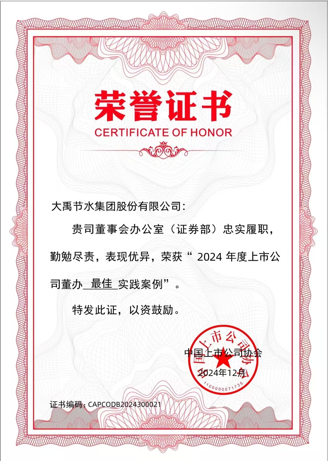 大禹節(jié)水集團連續(xù)三年獲得《上市公司董辦最佳實踐案例》,以及“上海證券報金質(zhì)量獎ESG獎”。