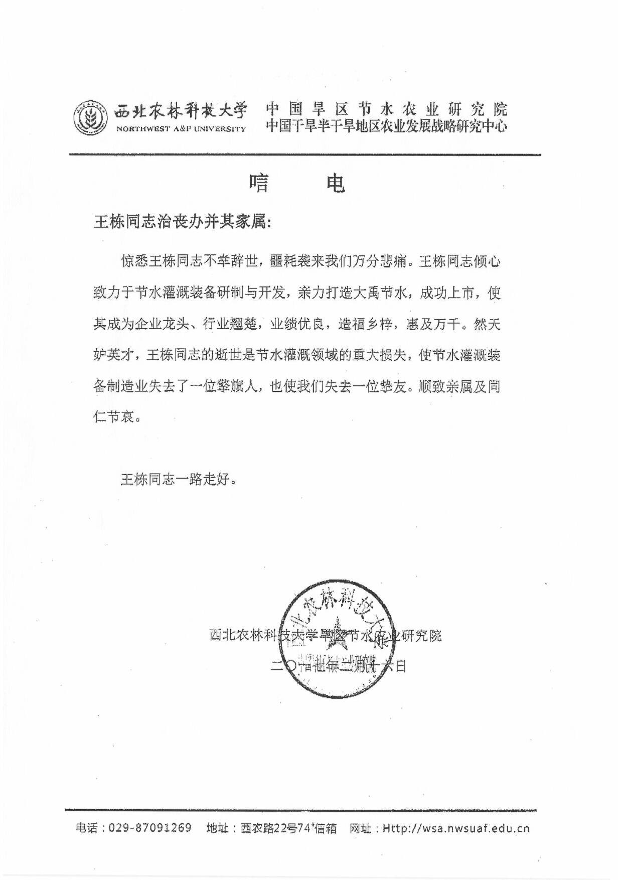 西北農(nóng)林科技大學(xué)旱區(qū)節(jié)水農(nóng)業(yè)研究院唁電