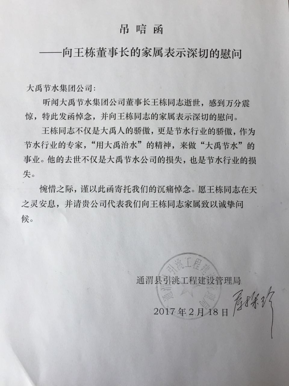 通渭縣引洮工程建設管理局唁電