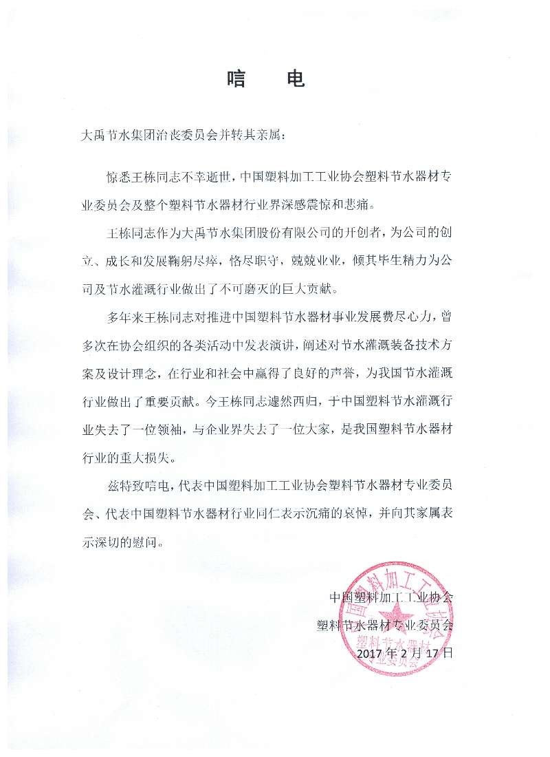 中國塑料加工工業(yè)協(xié)會塑料節(jié)水器材專業(yè)委員會唁電