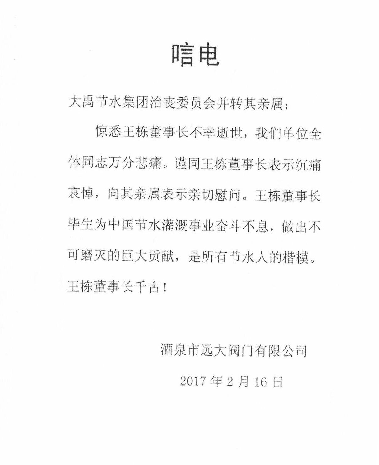 酒泉市遠(yuǎn)大閥門有限公司唁電