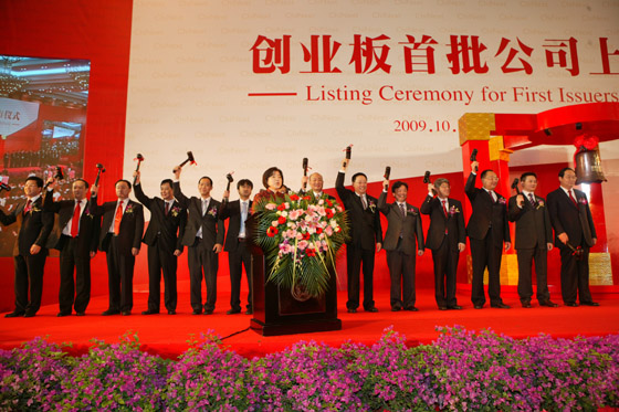 2009年10月30日上午8點(diǎn)30分,創(chuàng)業(yè)板上市儀式開始,深交所理事長(zhǎng)陳東征、央行與證監(jiān)會(huì)領(lǐng)導(dǎo)先后致辭。