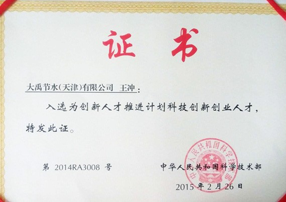 大禹節(jié)水集團公司黨委書記、大禹節(jié)水(天津)有限公司董事長王沖帶領(lǐng)團隊不斷開拓國內(nèi)、國際市場,為企業(yè)贏得了諸多殊榮,帶領(lǐng)公司經(jīng)營業(yè)績保持連年增長。依托公司先后建成了重點實驗室,成立了"大禹節(jié)水灌溉技術(shù)研究院","院士專家工作站",被認定為科技"小巨人"領(lǐng)軍企業(yè),產(chǎn)品被列入天津市殺手锏產(chǎn)品目錄。曾參與完成國家"863"計劃、"948"計劃、星火計劃、火炬計劃等10余項國家及省部級重大項目,先后在國內(nèi)級刊物和學術(shù)會議上發(fā)表相關(guān)專業(yè)和學術(shù)論文十余篇。完成"內(nèi)鑲貼片地埋式灌水器"等40多項科技成果和自主知識產(chǎn)權(quán)專利技術(shù),開發(fā)成功國家重點新產(chǎn)品3個,取得國家專利50多項,科技成果13項。主持研發(fā)的地埋式滴灌,解決了目前地埋滴灌存在根系入侵和負壓吸泥的國際性難題,填補了國內(nèi)國際空白。2016年1月8日,由王沖為第四完成人領(lǐng)銜的公司科研團隊與中國水利水電科學研究院、華北水利水電大學、水利部科技推廣中心、中國農(nóng)業(yè)科學院農(nóng)田灌溉研究所、大禹節(jié)水(天津)有限公司合作研發(fā)項目"精量滴灌關(guān)鍵技術(shù)與產(chǎn)品研發(fā)及應用"榮獲國家科技進步二等獎。2015年被國家科技部評為"創(chuàng)新人才推進計劃科技創(chuàng)新創(chuàng)業(yè)人才"。2017年,入選"萬人計劃"國家高層次人才特殊支持計劃領(lǐng)軍人才。完成的"噴、微灌水肥一體化精量調(diào)控技術(shù)與規(guī)模化應用"榮獲2018年大禹水利科學技術(shù)一等獎。