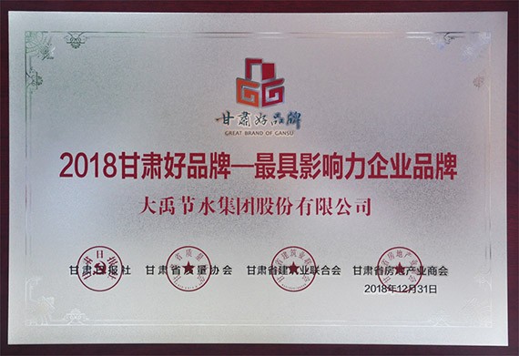 1月11日上午,由甘肅省發(fā)改委、省市場(chǎng)監(jiān)管局指導(dǎo),甘肅日?qǐng)?bào)社、甘肅省質(zhì)量協(xié)會(huì)、甘肅省建筑業(yè)聯(lián)合會(huì)、甘肅省房地產(chǎn)業(yè)商會(huì)聯(lián)合主辦的2019甘肅品牌論壇在蘭州寧臥莊賓館舉行。本屆論壇主旨為"聚合品牌力量 ,推動(dòng)創(chuàng)新發(fā)展",大禹節(jié)水集團(tuán)股份有限公司等20家企業(yè)榮獲"最具影響力企業(yè)品牌",大禹節(jié)水集團(tuán)黨委書(shū)記王沖代表獲獎(jiǎng)企業(yè)做交流發(fā)言。