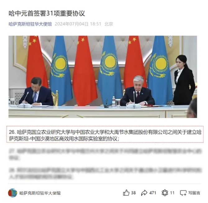 此外,兩國(guó)元首的見證下,雙方代表團(tuán)簽署了31項(xiàng)重要協(xié)議。其中,第26項(xiàng)為哈薩克國(guó)立農(nóng)業(yè)研究大學(xué)與中國(guó)農(nóng)業(yè)大學(xué)和大禹節(jié)水集團(tuán)股份有限公司之間關(guān)于建立哈薩克斯坦-中國(guó)沙漠地區(qū)高效用水國(guó)際實(shí)驗(yàn)室的協(xié)議。