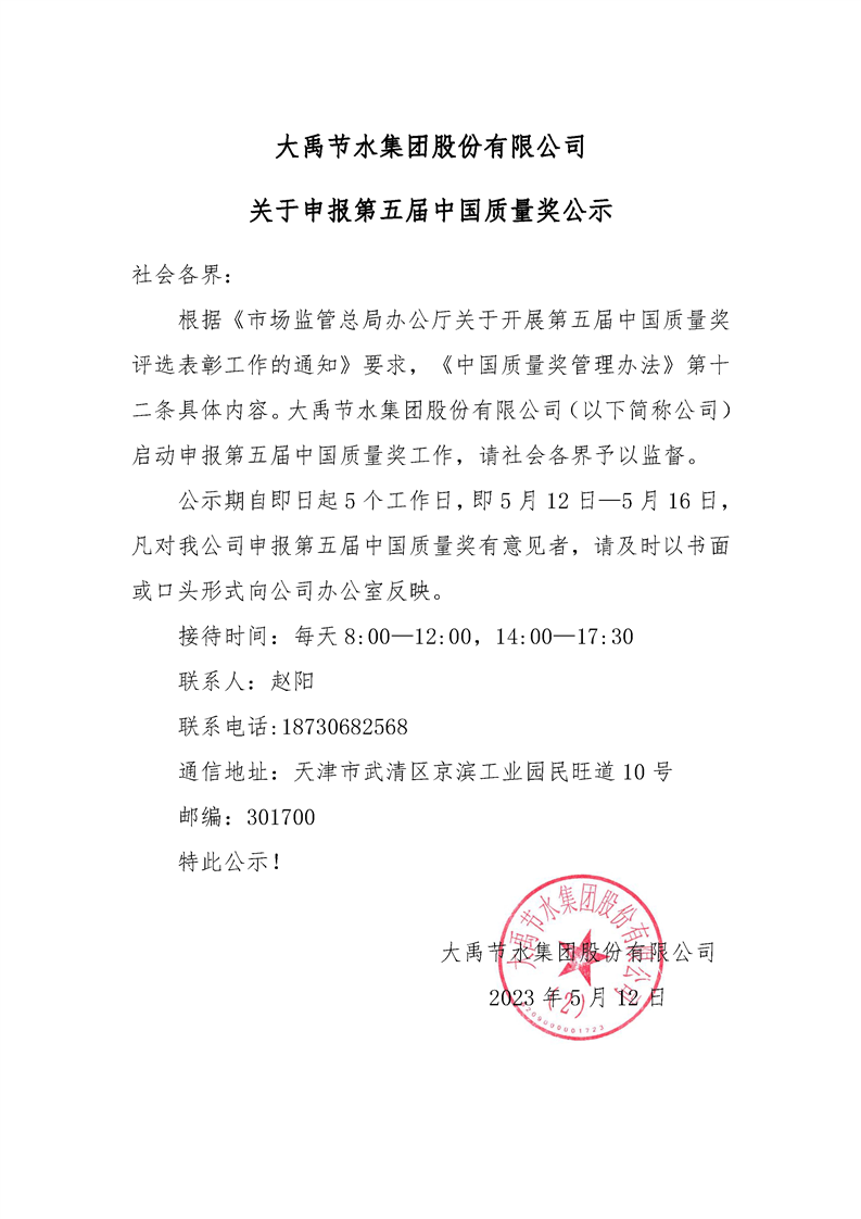 大禹節(jié)水集團(tuán)股份有限公司關(guān)于申報(bào)第五屆中國質(zhì)量獎(jiǎng)公示