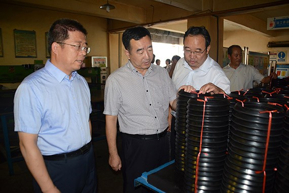水利部調(diào)研組首先來(lái)到大禹節(jié)水集團(tuán)展廳,從公司發(fā)展歷程、企業(yè)文化、榮譽(yù)資質(zhì)、國(guó)際交流與考察等方面對(duì)大禹節(jié)水集團(tuán)進(jìn)行了全面了解,大禹節(jié)水集團(tuán)董事長(zhǎng)王棟向調(diào)研組一行進(jìn)行了詳細(xì)介紹;隨后,調(diào)研組深入公司滴灌車間、現(xiàn)代化灌溉設(shè)備裝備中心及管件車間生產(chǎn)一線,邊走邊看,邊聽(tīng)邊問(wèn),不時(shí)與集團(tuán)公司董事長(zhǎng)王棟等公司陪同人員交流,了解公司生產(chǎn)經(jīng)營(yíng)情況、取得的成績(jī)及技術(shù)創(chuàng)新等相關(guān)情況,董事長(zhǎng)王棟一一進(jìn)行了介紹和解答。大禹節(jié)水集團(tuán)產(chǎn)品種類的全面性、研發(fā)銷售設(shè)計(jì)施工一體化及嚴(yán)格的產(chǎn)品質(zhì)量檢驗(yàn)流程獲得了調(diào)研組的充分肯定。