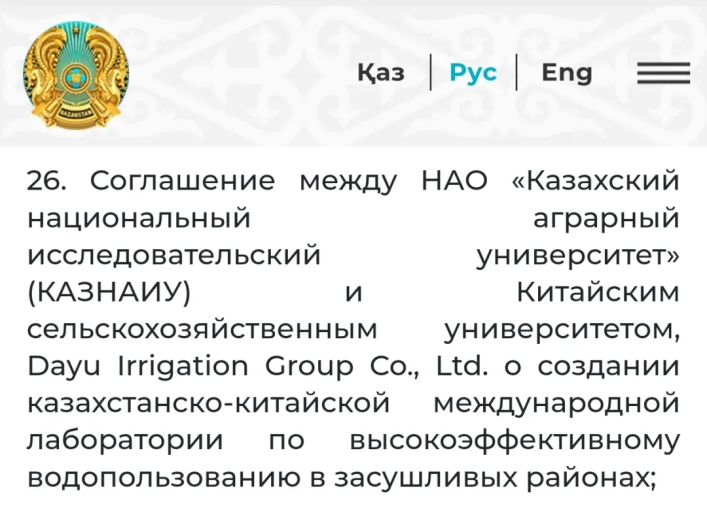 此外,兩國(guó)元首的見證下,雙方代表團(tuán)簽署了31項(xiàng)重要協(xié)議。其中,第26項(xiàng)為哈薩克國(guó)立農(nóng)業(yè)研究大學(xué)與中國(guó)農(nóng)業(yè)大學(xué)和大禹節(jié)水集團(tuán)股份有限公司之間關(guān)于建立哈薩克斯坦-中國(guó)沙漠地區(qū)高效用水國(guó)際實(shí)驗(yàn)室的協(xié)議。
