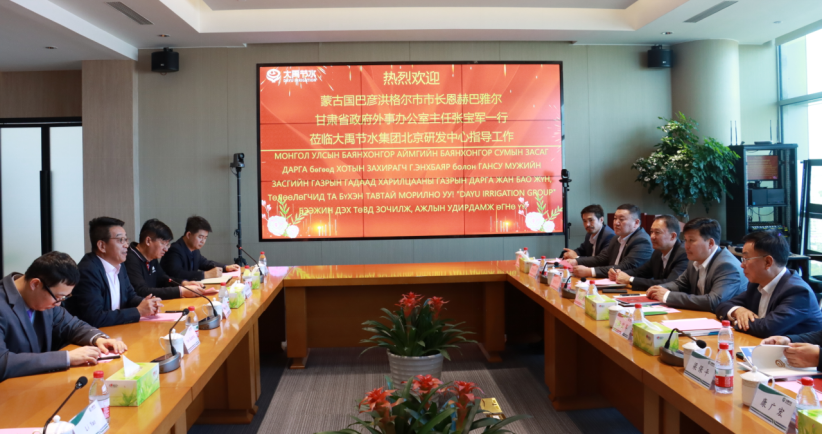 10月18日上午,蒙古國巴彥洪格爾市市長恩赫巴雅爾(Enkhbayar)、巴彥洪格爾市呼拉爾公民代表主席巴圖才仁(Battseren)、巴彥洪格爾輸電配電公司執(zhí)行董事烏蘭巴雅爾(Ulambayar);甘肅省政府外事辦黨組書記、辦公室主任張寶軍,省政府外事辦黨組成員、對外友協(xié)專職副會長梁保平,省對外友協(xié)友城工作處處長康廣宏一行領(lǐng)導蒞臨大禹節(jié)水集團北京研發(fā)中心考察座談,大禹節(jié)水集團黨委書記王沖等陪同。