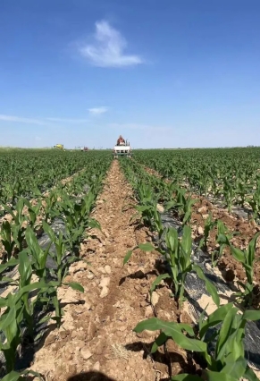 寧夏同心基地目前以玉米為主要種植作物,部分土地采用大豆套種玉米的模式。在籽粒玉米播種過(guò)程中,使用氣吸式精量播種機(jī),能夠一次性完成開(kāi)溝、施肥、播種、鋪設(shè)滴灌帶、覆土、鎮(zhèn)壓等多道工序,實(shí)現(xiàn)種肥同下,確保單穴單粒的播種效果,顯著提升作業(yè)精度和效率。2024年5月,所有作物的播種工作已全面完成,且作物生長(zhǎng)態(tài)勢(shì)表現(xiàn)良好。經(jīng)過(guò)對(duì)現(xiàn)有作物生長(zhǎng)狀況的綜合分析,預(yù)測(cè)每畝地產(chǎn)量將較傳統(tǒng)種植方式增產(chǎn)約300斤左右。