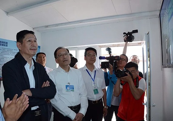 ▲農(nóng)業(yè)農(nóng)村部總農(nóng)藝師馬愛國(左一)天津市農(nóng)村工作委員會主任、黨委書記沈欣(左二)大禹節(jié)水集團黨委書記王沖(左三)觀看溫室信息管理系統(tǒng)