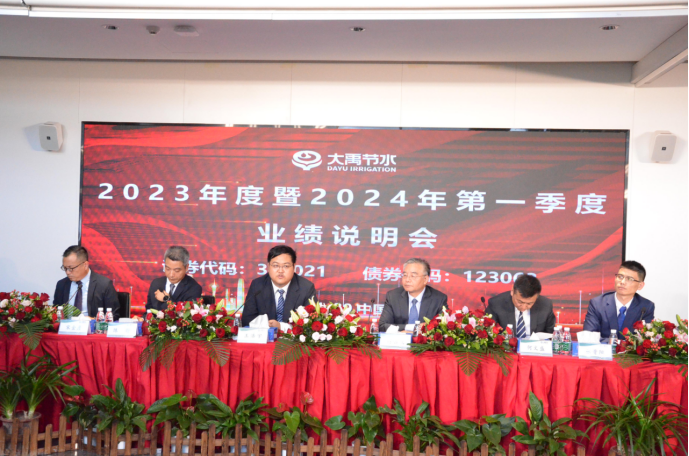 4月30日,大禹節(jié)水集團(tuán)股份有限公司(以下簡(jiǎn)稱“大禹節(jié)水”)2023年度暨2024年第一季度業(yè)績(jī)說(shuō)明會(huì)在北京研發(fā)中心召開。集團(tuán)董事長(zhǎng)王浩宇,獨(dú)立董事何文盛,首席科學(xué)家、研究院院長(zhǎng)高占義,副總裁、董事會(huì)秘書陳靜,副總裁、財(cái)務(wù)負(fù)責(zé)人宋金彥,以及保薦代表人張貴陽(yáng)等領(lǐng)導(dǎo)嘉賓出席會(huì)議。會(huì)上,董事會(huì)秘書對(duì)2023年度及2024年第一季度的經(jīng)營(yíng)情況做了匯報(bào),與會(huì)領(lǐng)導(dǎo)、嘉賓對(duì)投資人關(guān)心的問(wèn)題進(jìn)行了現(xiàn)場(chǎng)解答。