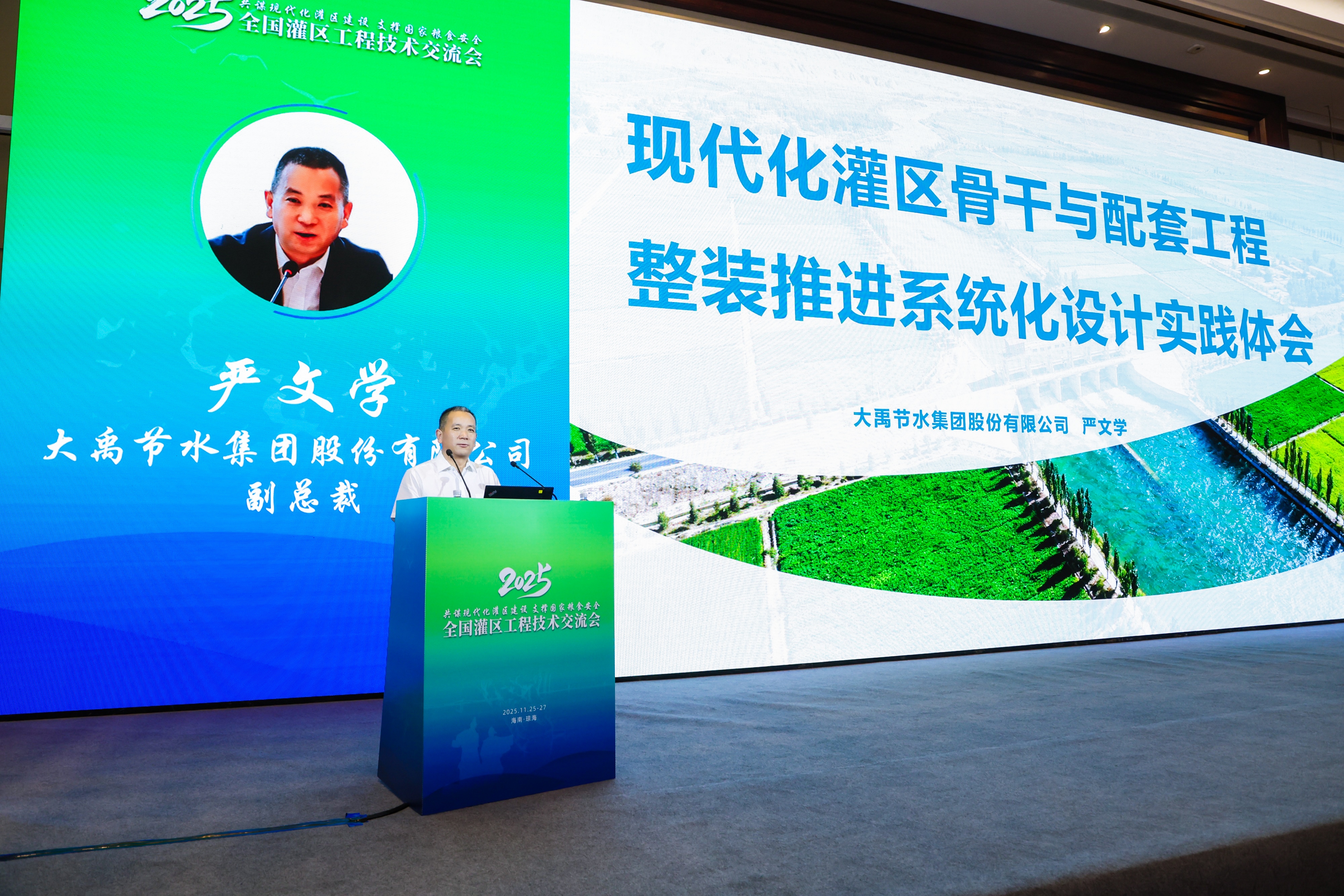 作為本次大會的承辦單位之一,大禹節(jié)水集團積極參與會議組織與交流環(huán)節(jié),充分發(fā)揮企業(yè)在節(jié)水灌溉與灌區(qū)現(xiàn)代化建設(shè)領(lǐng)域的專業(yè)優(yōu)勢與引領(lǐng)作用。在專題報告環(huán)節(jié),大禹節(jié)水集團副總裁、設(shè)計集團董事長嚴(yán)文學(xué)代表公司作了題為《現(xiàn)代化灌區(qū)骨干與配套工程整裝推進系統(tǒng)化設(shè)計實踐體會》的專題報告。